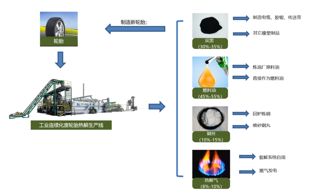 恒譽(yù)環(huán)保自主研發(fā)的“工業(yè)連續(xù)化廢輪胎熱解生產(chǎn)線”通過對廢輪胎中的高分子聚合物進(jìn)行較徹底的分解,使其回到小分子或單體狀態(tài),產(chǎn)出燃料油、炭黑、鋼絲,在安全、環(huán)保、連續(xù)穩(wěn)定運(yùn)行的前提下,實(shí)現(xiàn)對廢輪胎的資源化、無害化、減量化處置。