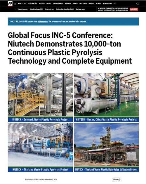 第五屆政府間塑料污染談判委員會(INC-5)在INC-5會議期間,美國最大的通訊社,將關(guān)注重點(diǎn)從會場內(nèi)轉(zhuǎn)向會場外,,并以“Niutech Demonstrates 10,000-ton Continuous Plastic Pyrolysis Technology and Complete Equipment”為題,報道了恒譽(yù)環(huán)保在丹麥、泰國、韓國及中國本土,持續(xù)穩(wěn)定運(yùn)行數(shù)年的多個“全球廢塑料污染治理,離不開先進(jìn)技術(shù)的支撐,其中來自中國的恒譽(yù)環(huán)保,,安全環(huán)保地將廢塑料變?yōu)樵偕Y源產(chǎn)品,減少了環(huán)境污染的同時,為經(jīng)濟(jì)綠色發(fā)展做出貢獻(xiàn),為全球廢塑料污染治理提供了示范案例。